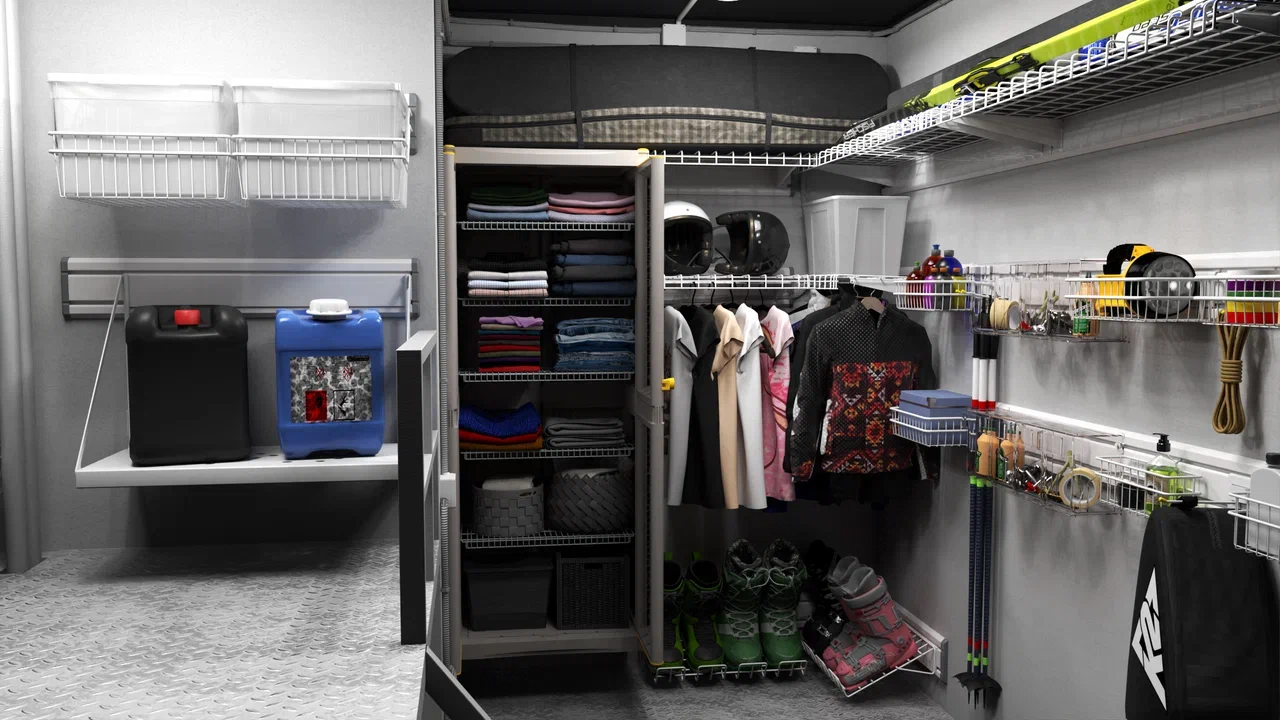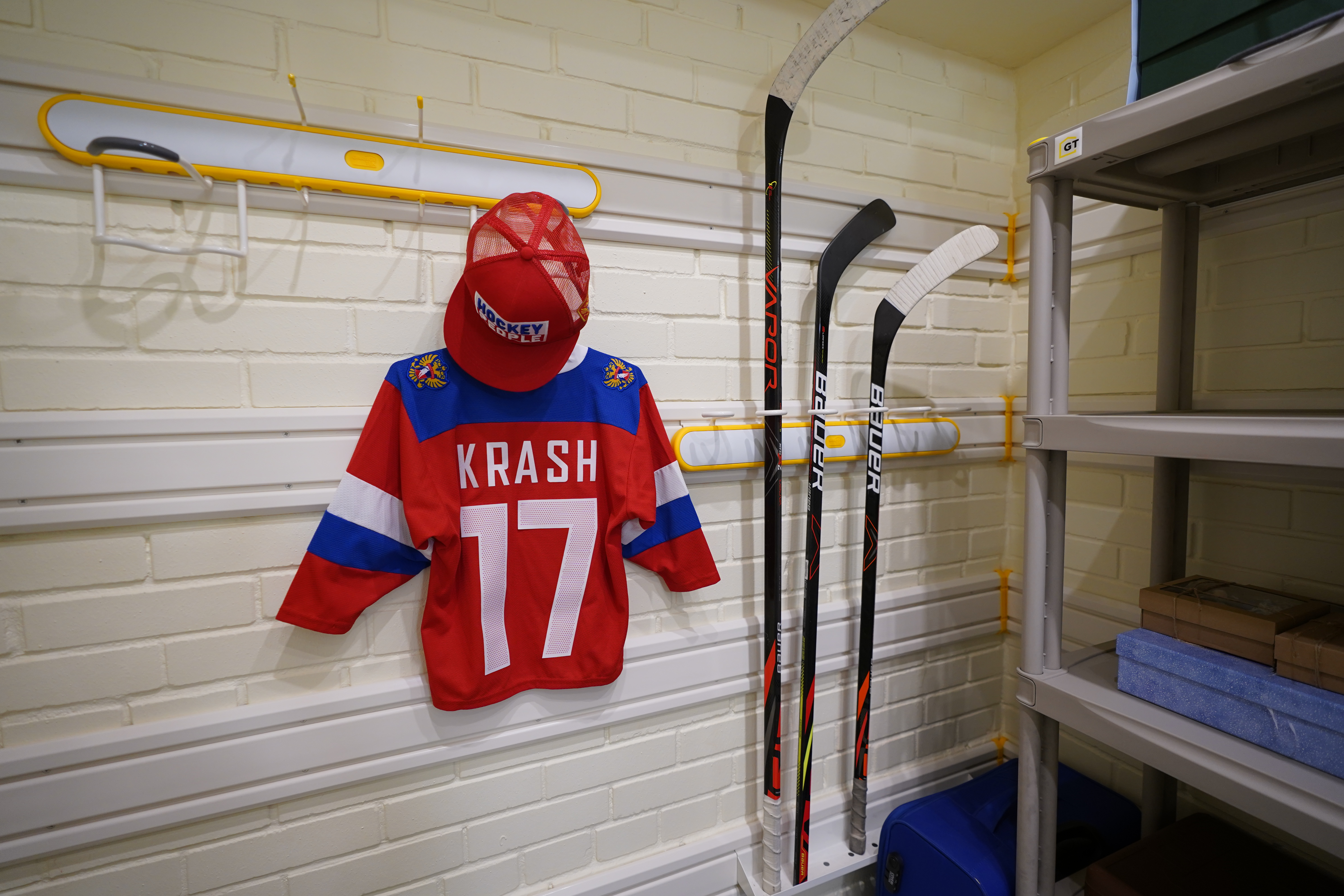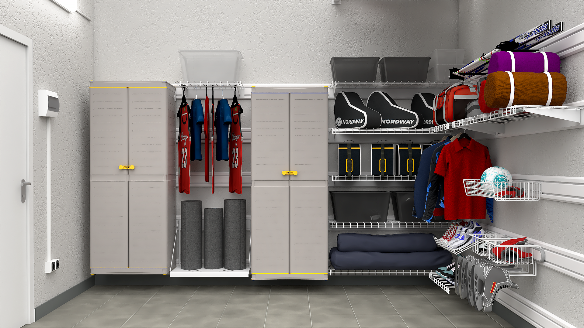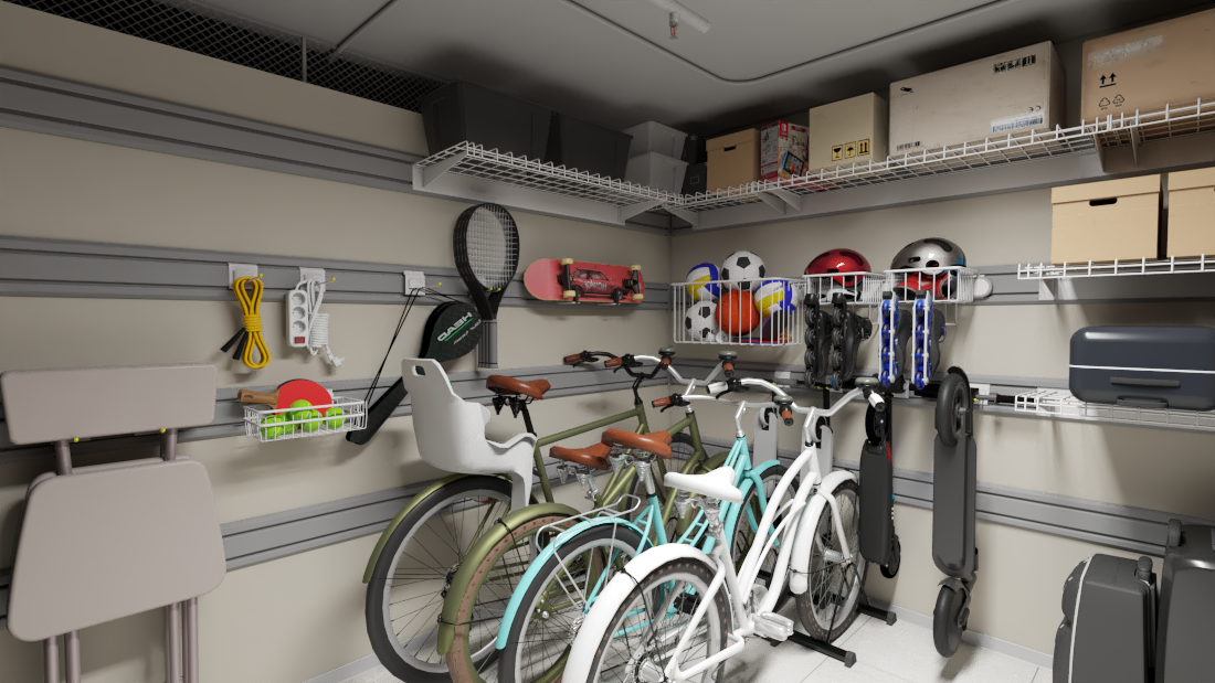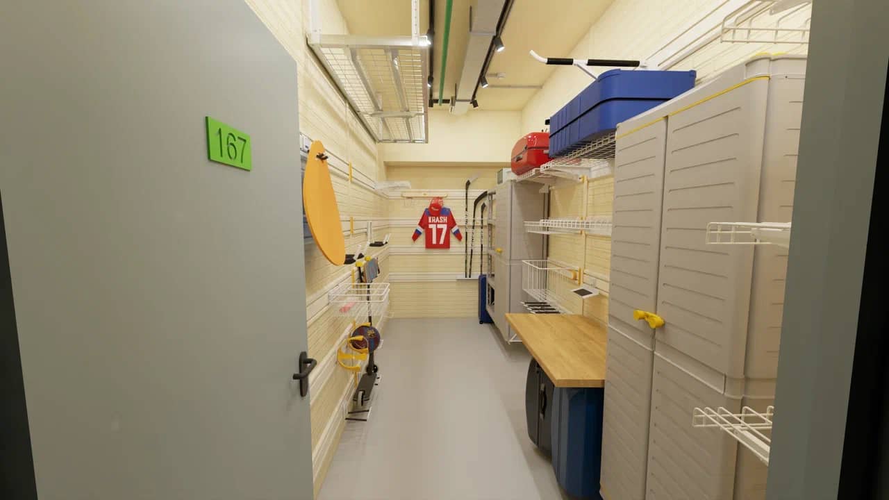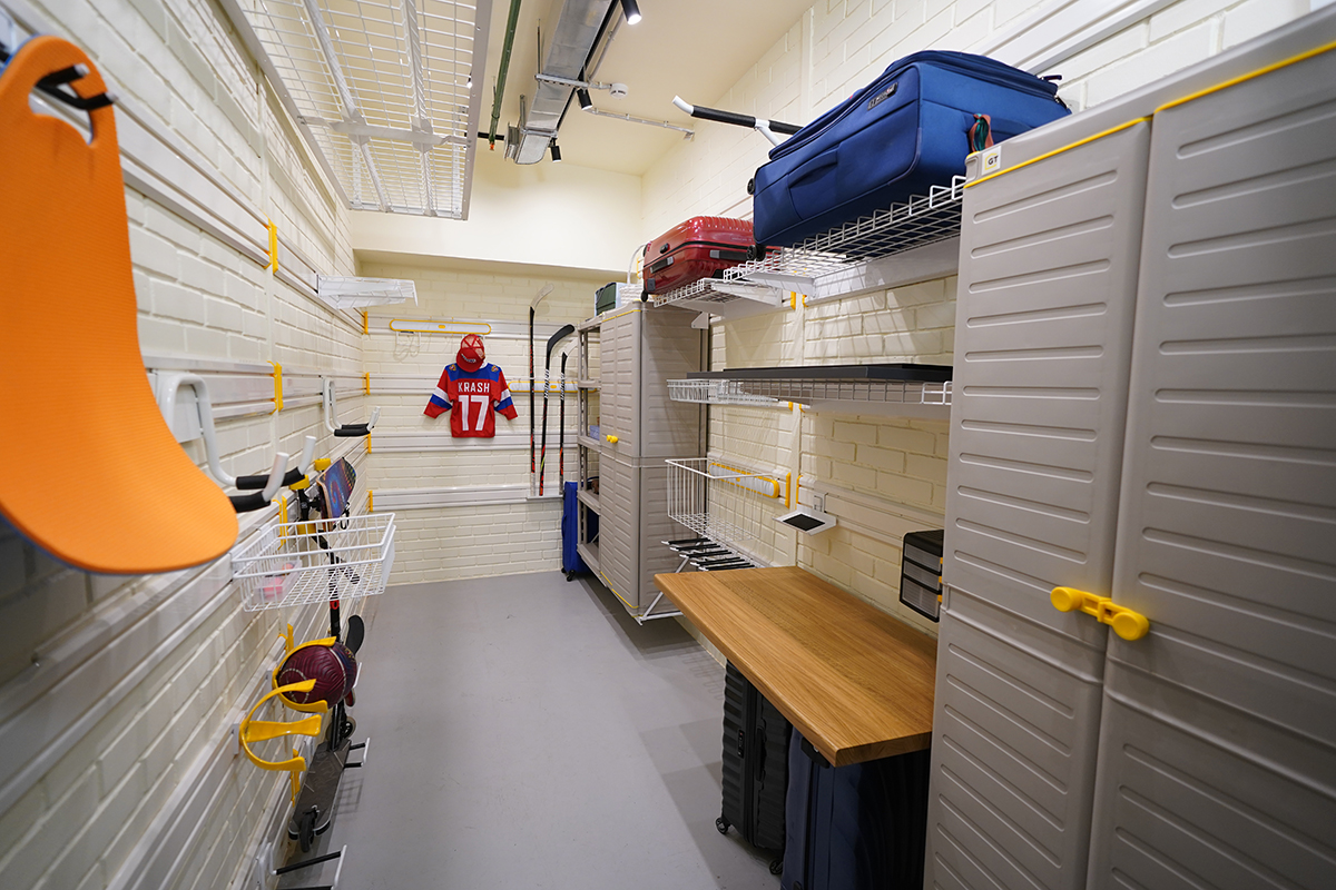 Основную часть пространства кладовой будет занимать инвентарь для зимних видов спорта: коньки, сноуборды, ледянки, тюбинги, хоккейная экипировка.
